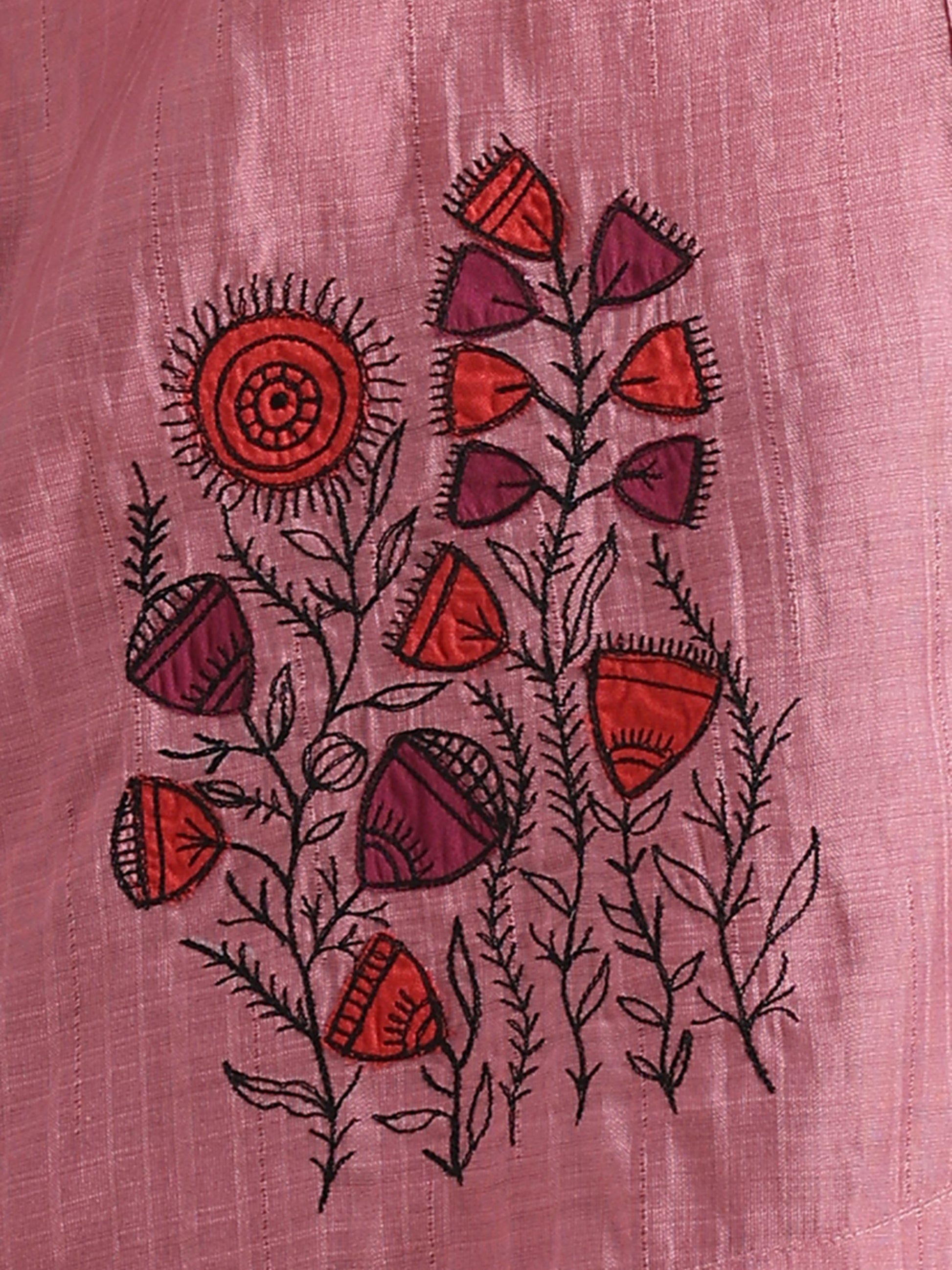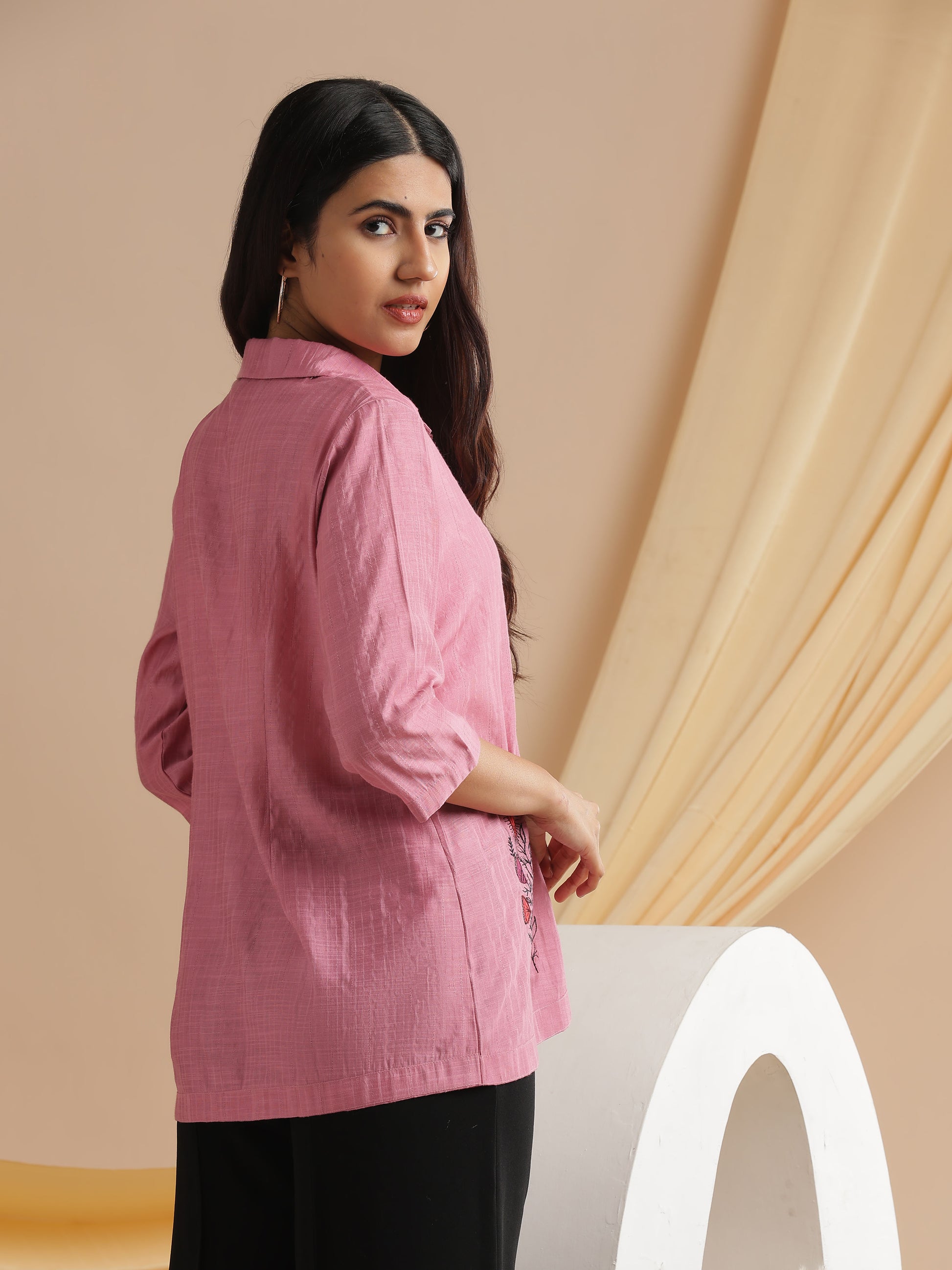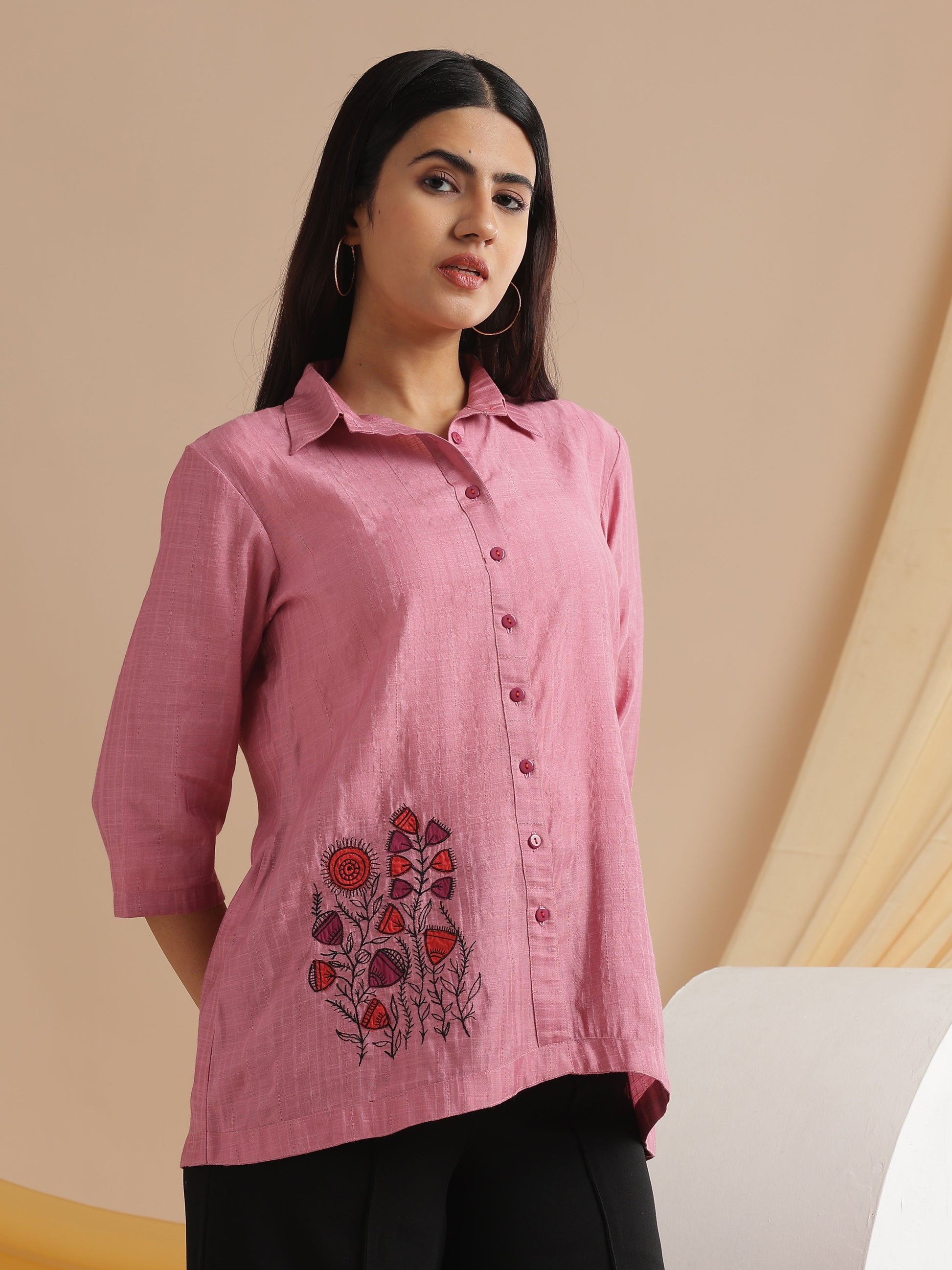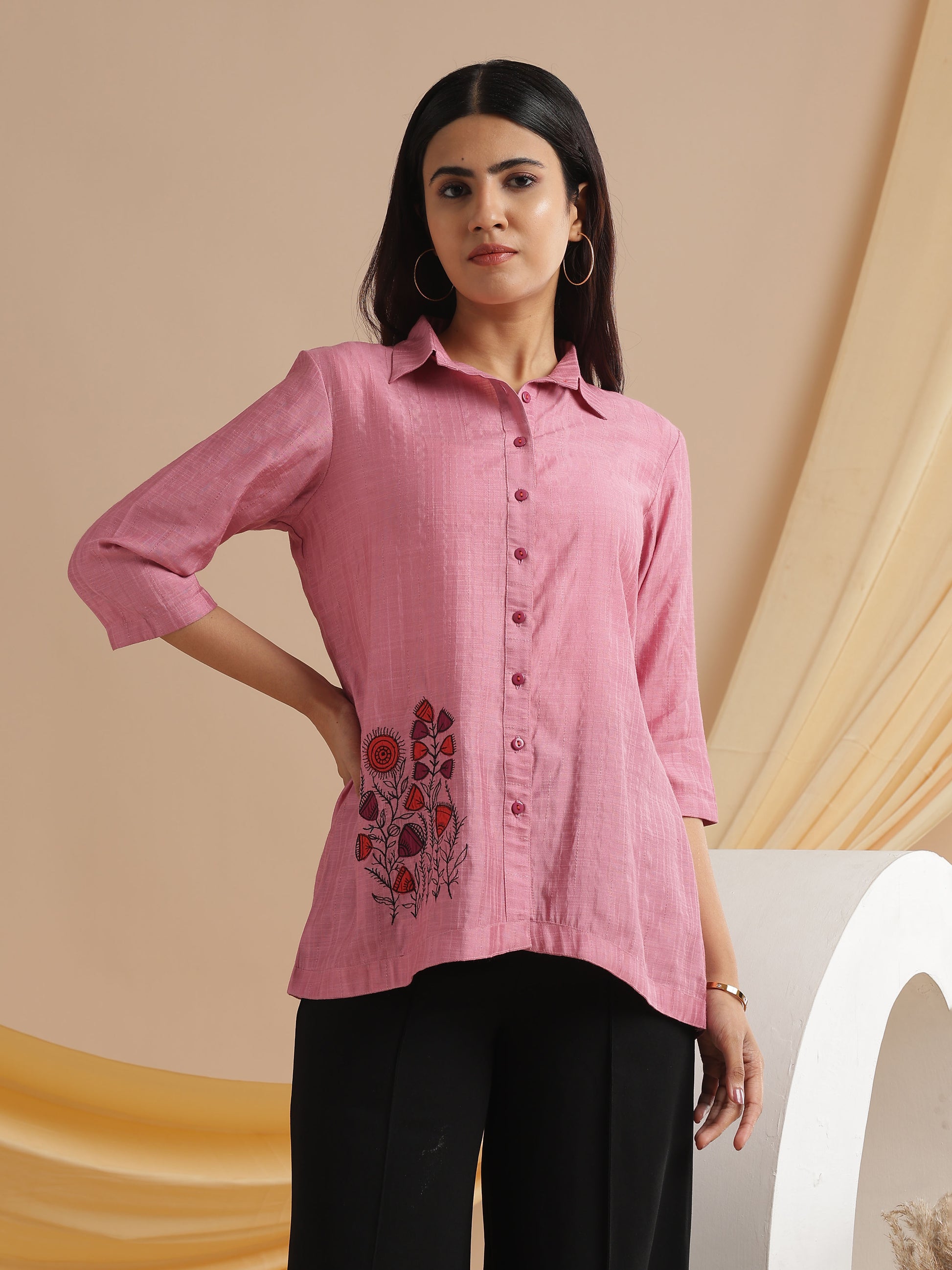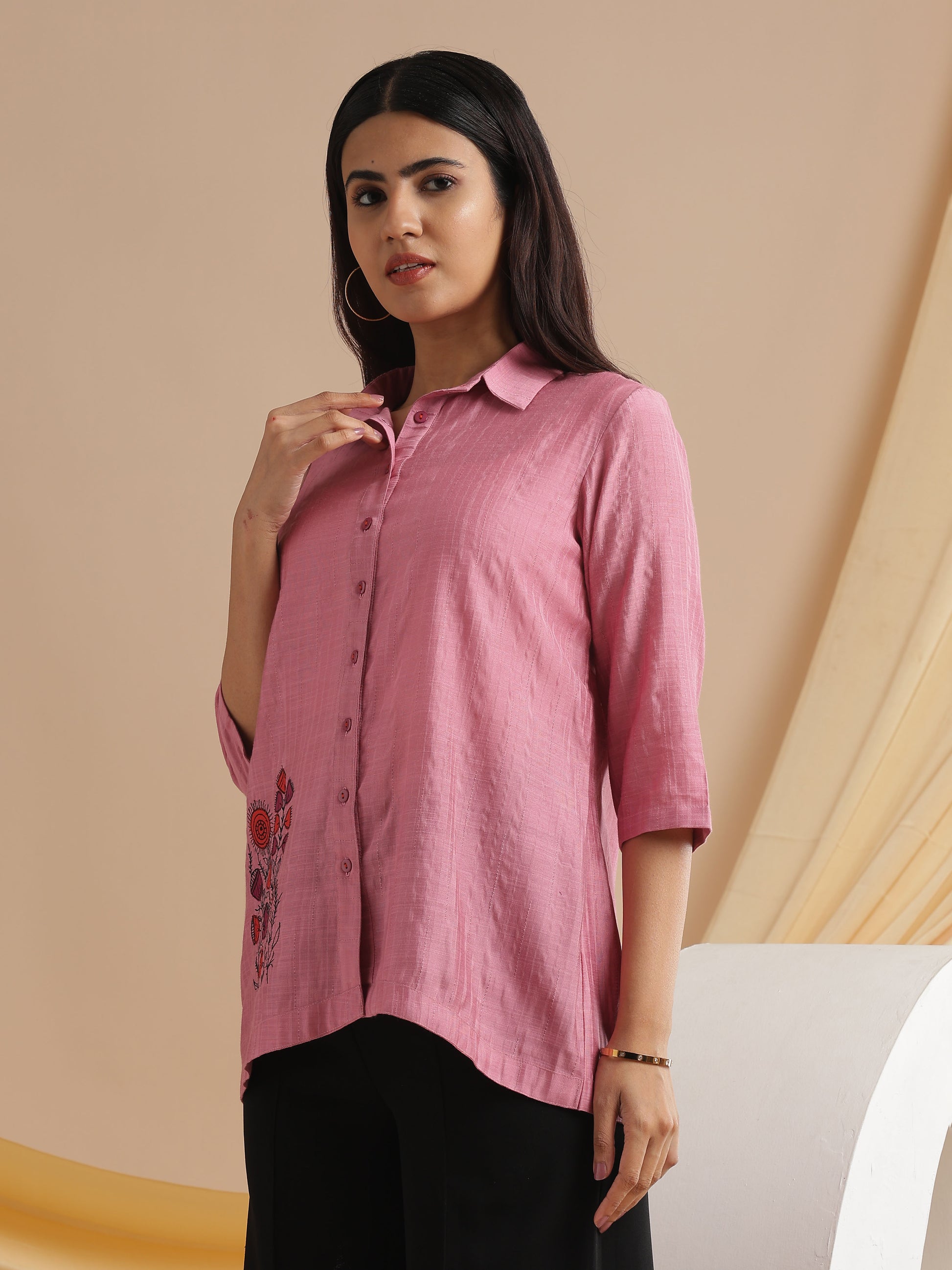 Floral Machine Embroidery Shirt in Pink Poly Viscose