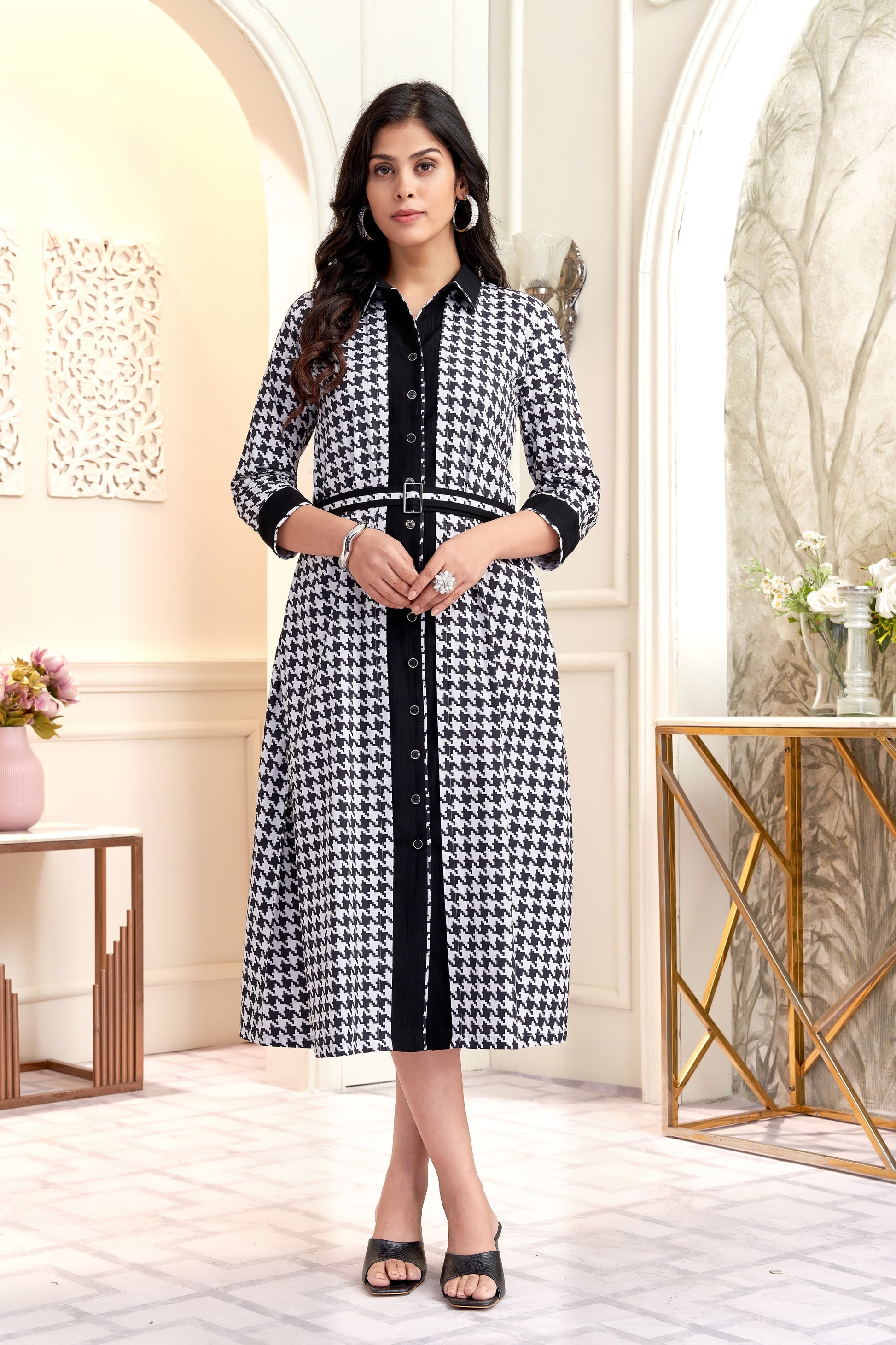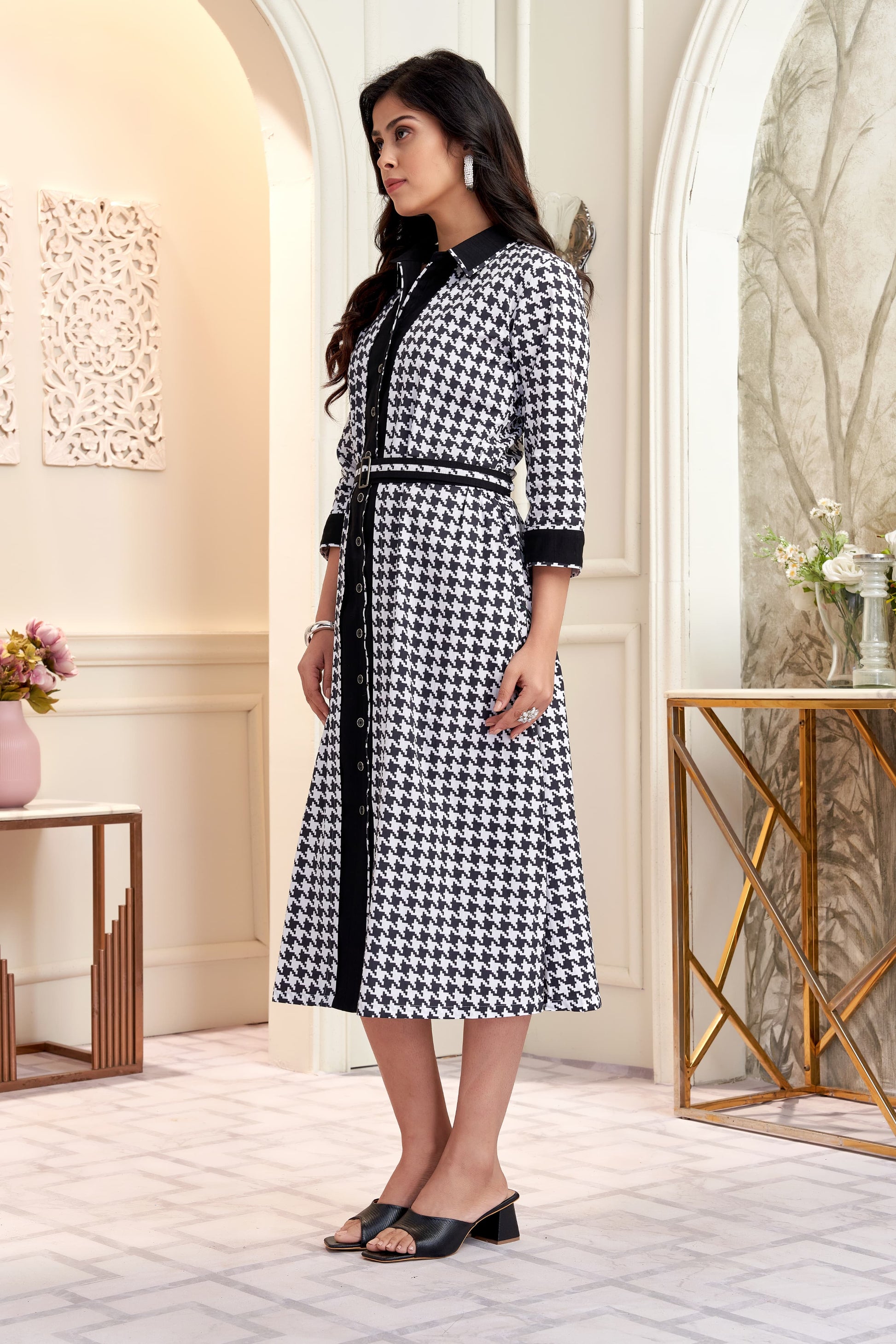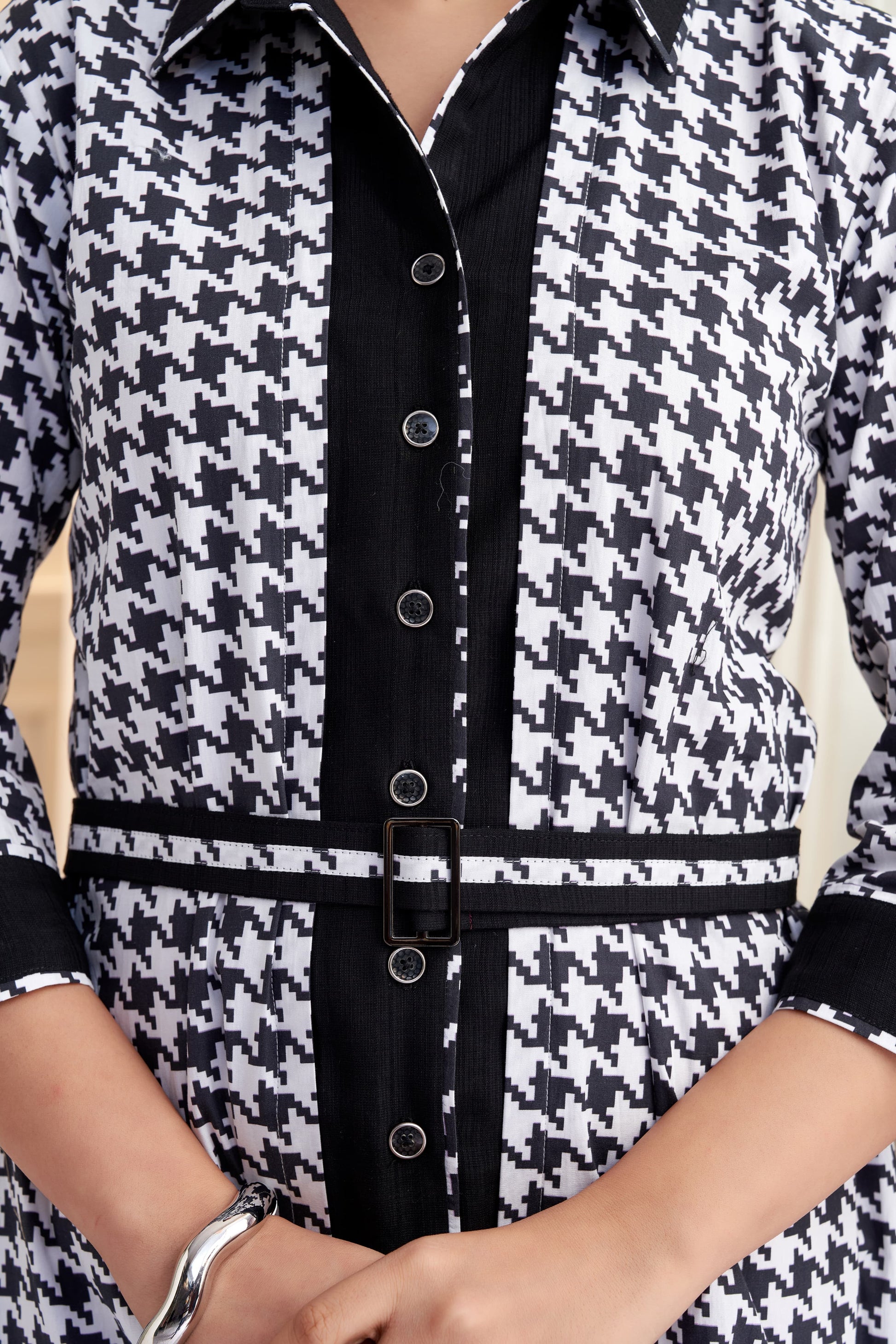 Monochrome Houndstooth Shirt Dress