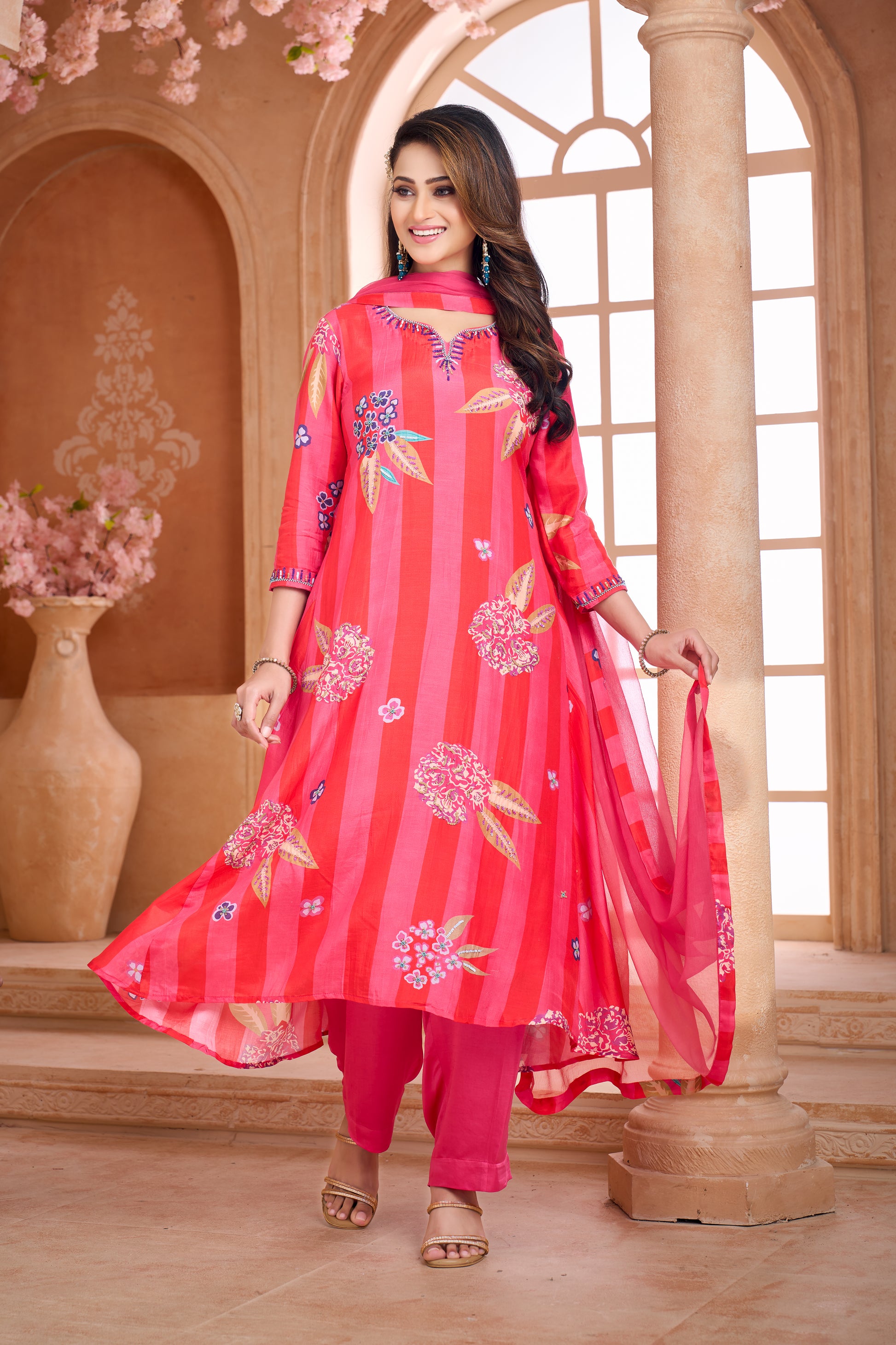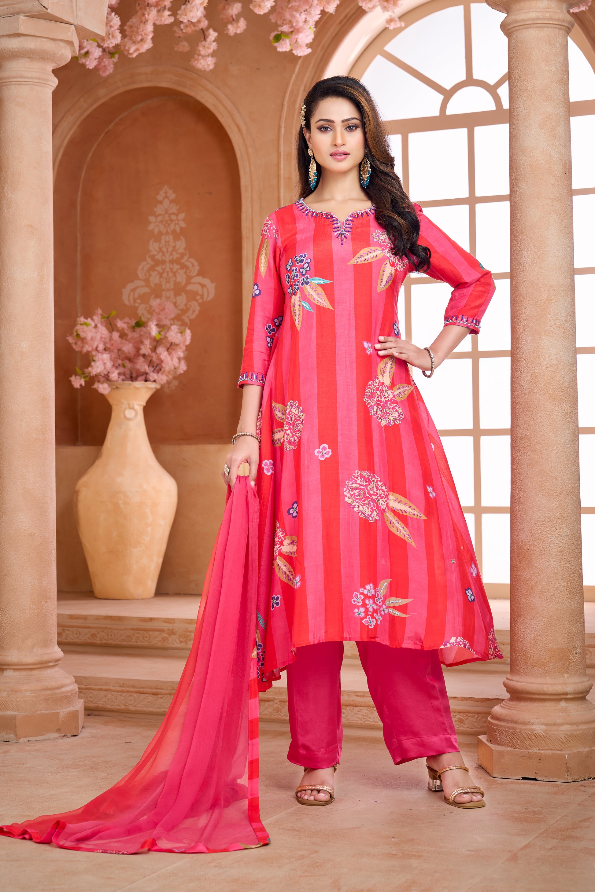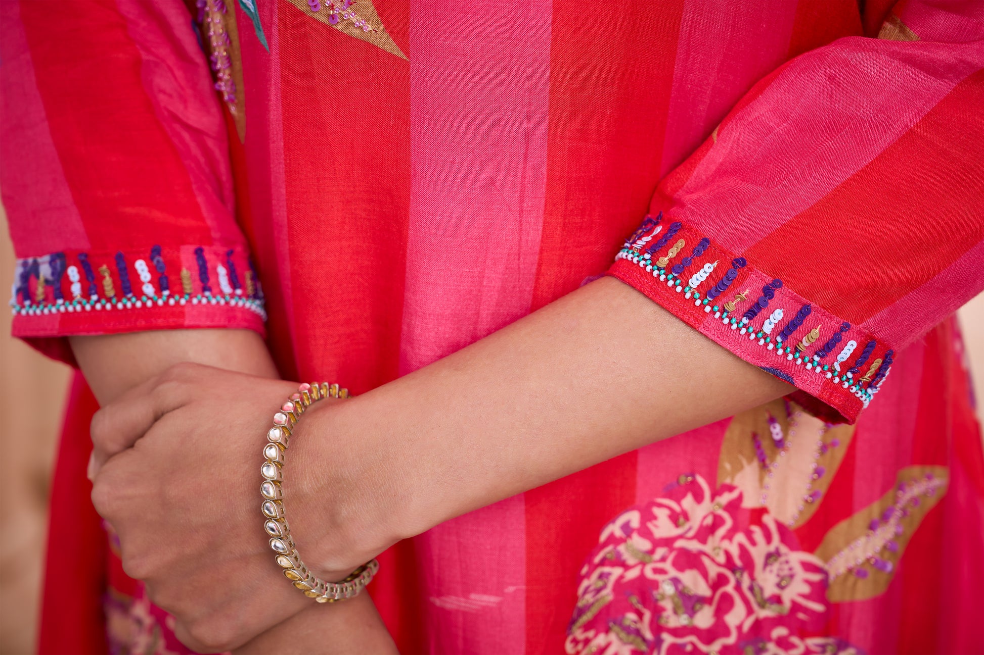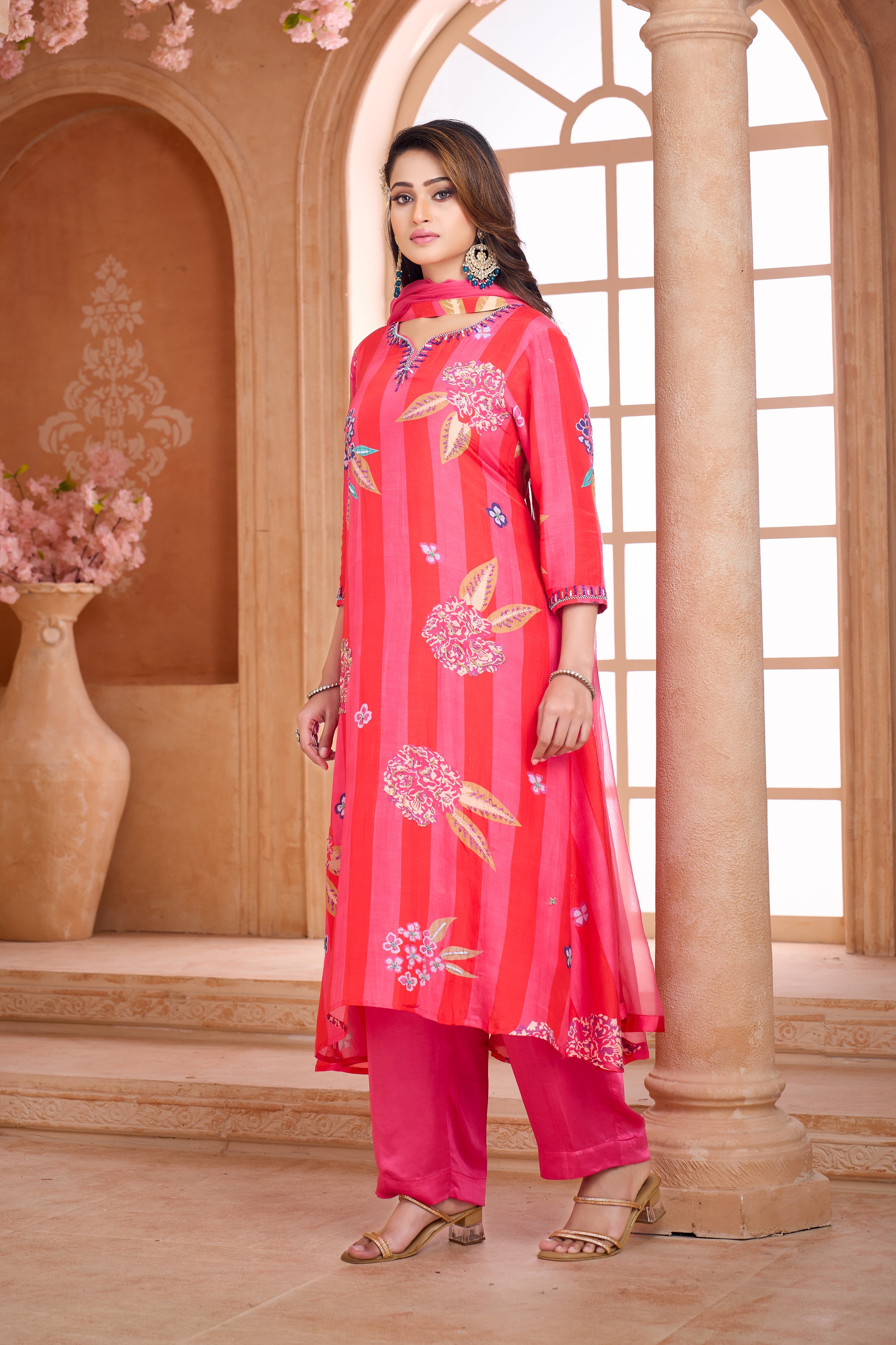 Pink floral hand-embroidered 3- piece kurta set