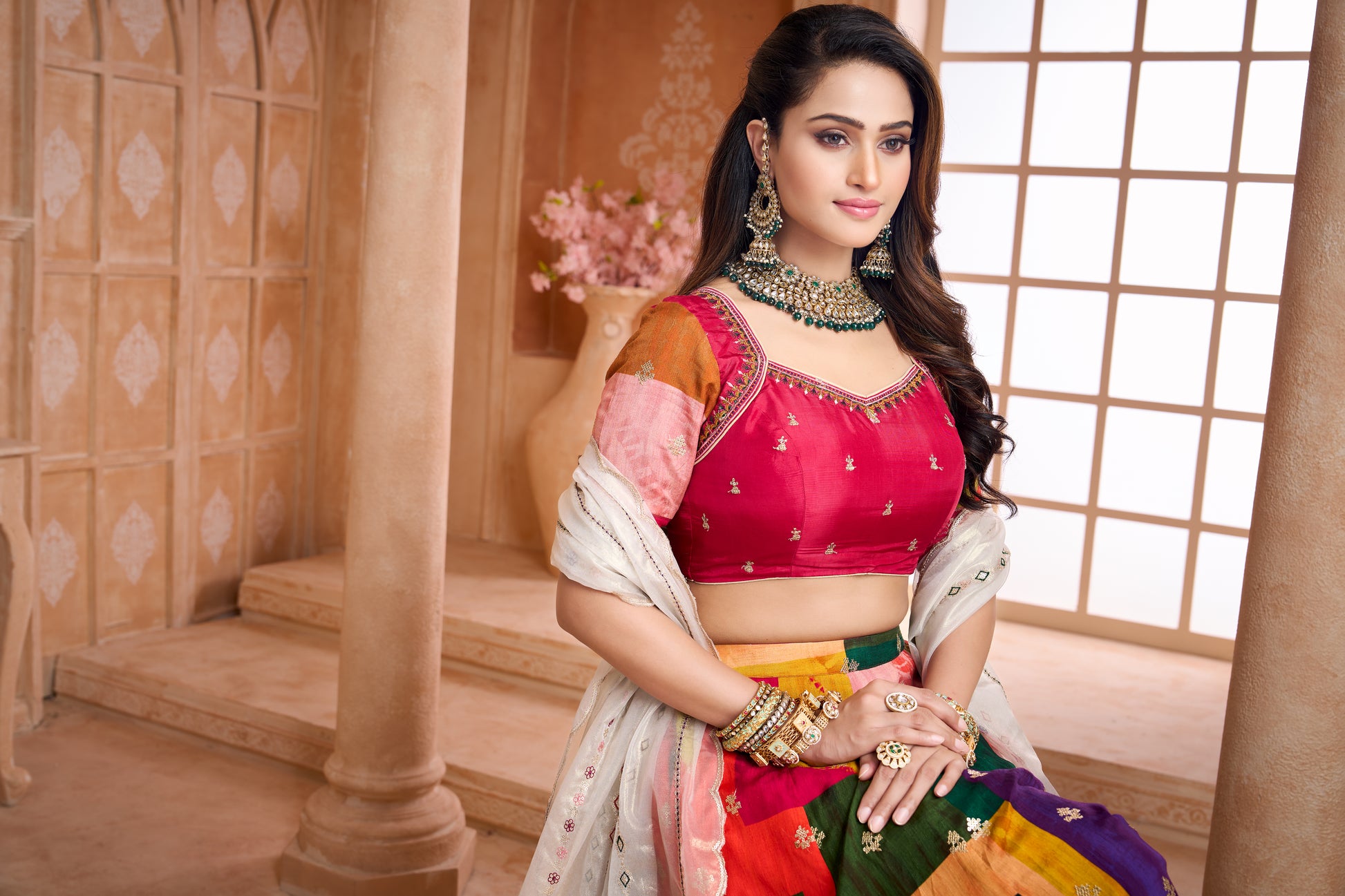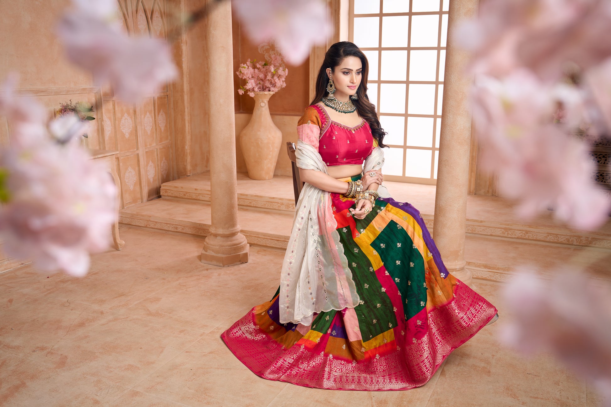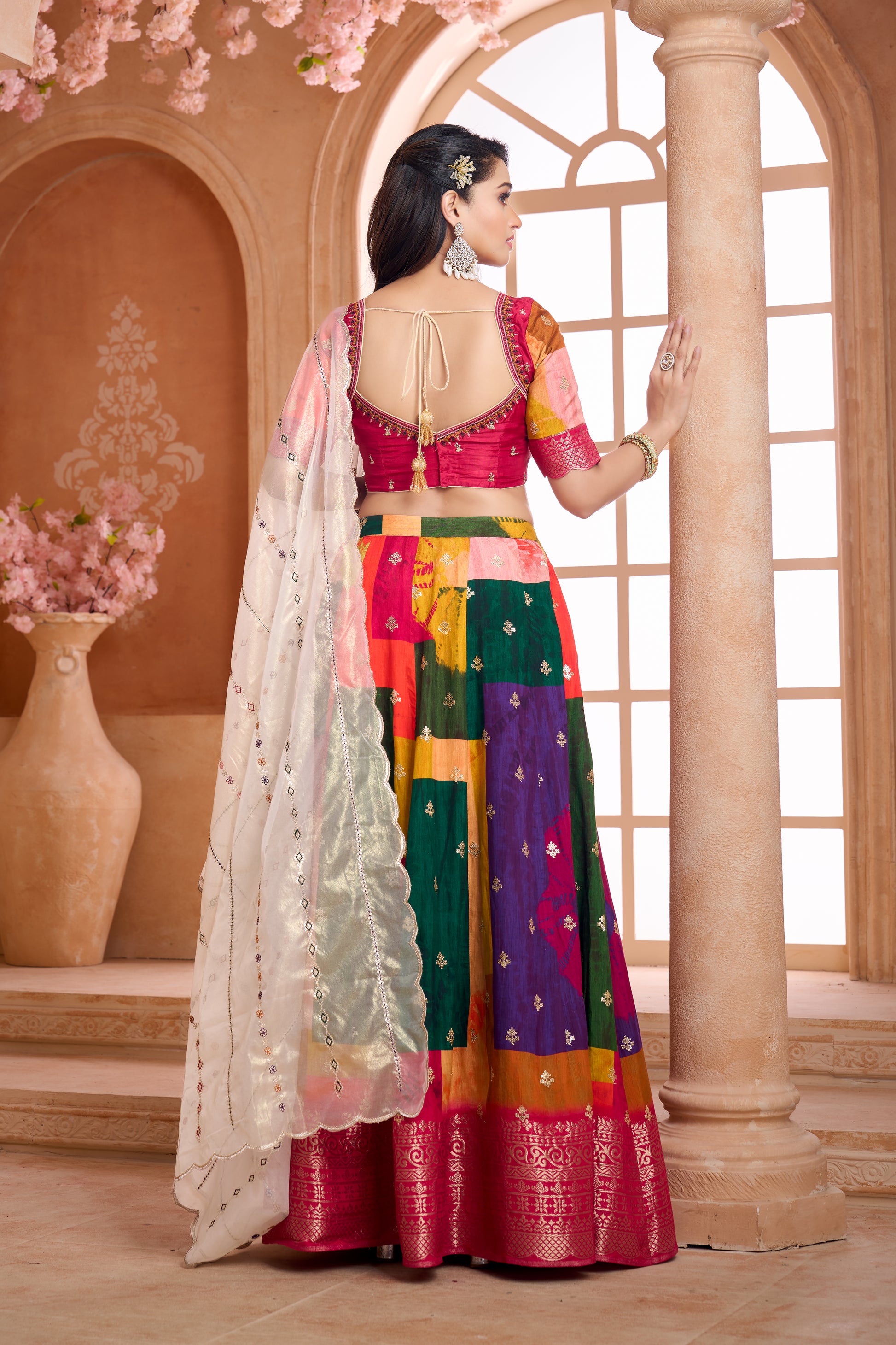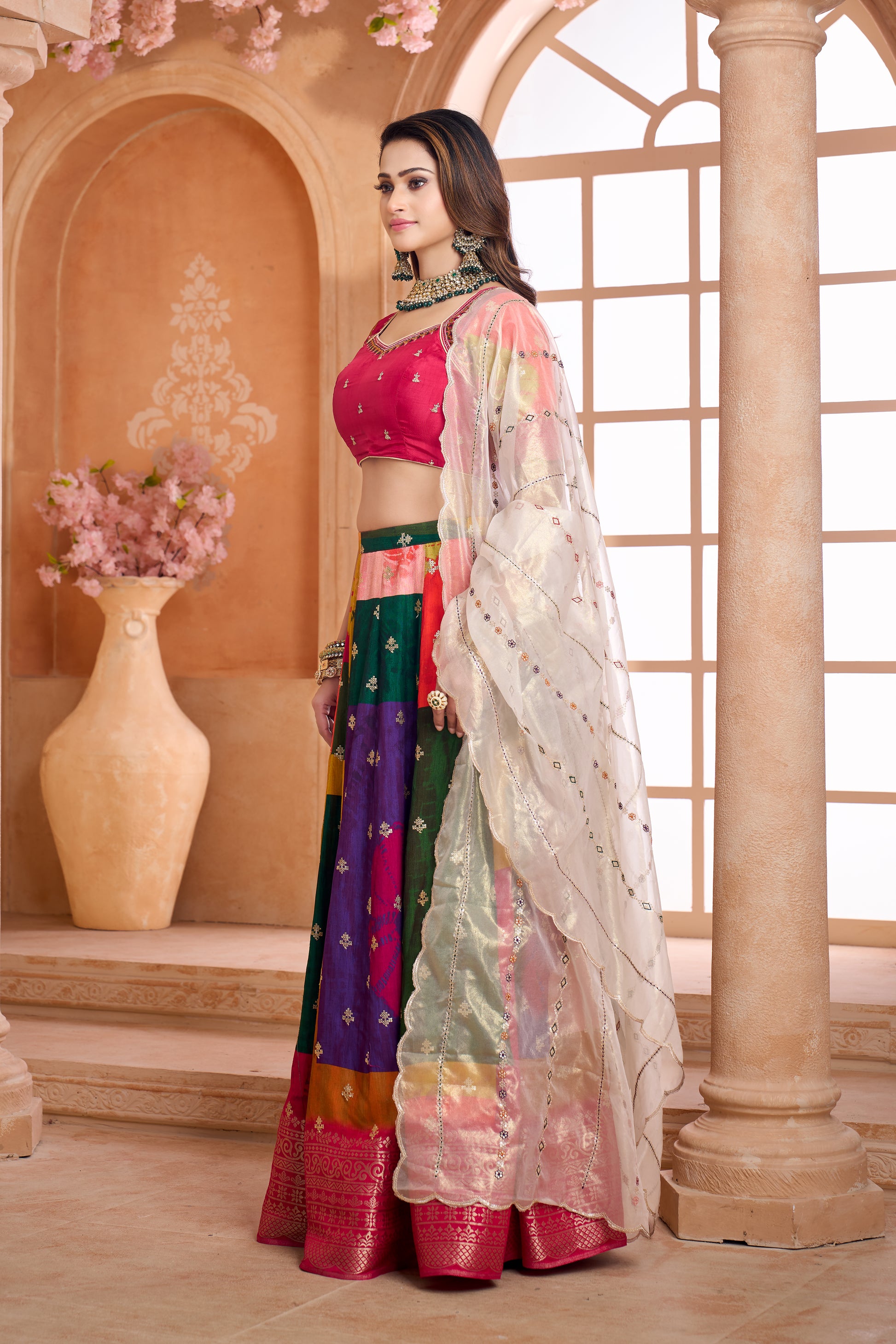 Elevate your festive wardrobe with this stunning multi-colour dupion lehenga choli set that blends traditional elegance with modern grace. Lehenga:- Crafted in rich dupion fabric with a vibrant multi-colour featuring shades of green, purple, orange, pink, and yellow, finished with an intricately border in magenta. Adorned with delicate machine embroidery and sequin work for graceful festive appeal. Blouse:- Designed in a magenta base with dainty embroidered motifs. The blouse features a stylish queen anne neckline with embroidered detailing,  elbow  with scallop sleeves. Dupatta:- Made in organza shimmer  fabric, in an elegant matellic shimmer shade with scalloped edges and fine machine embroidery work that adds a touch of subtle shimmer.