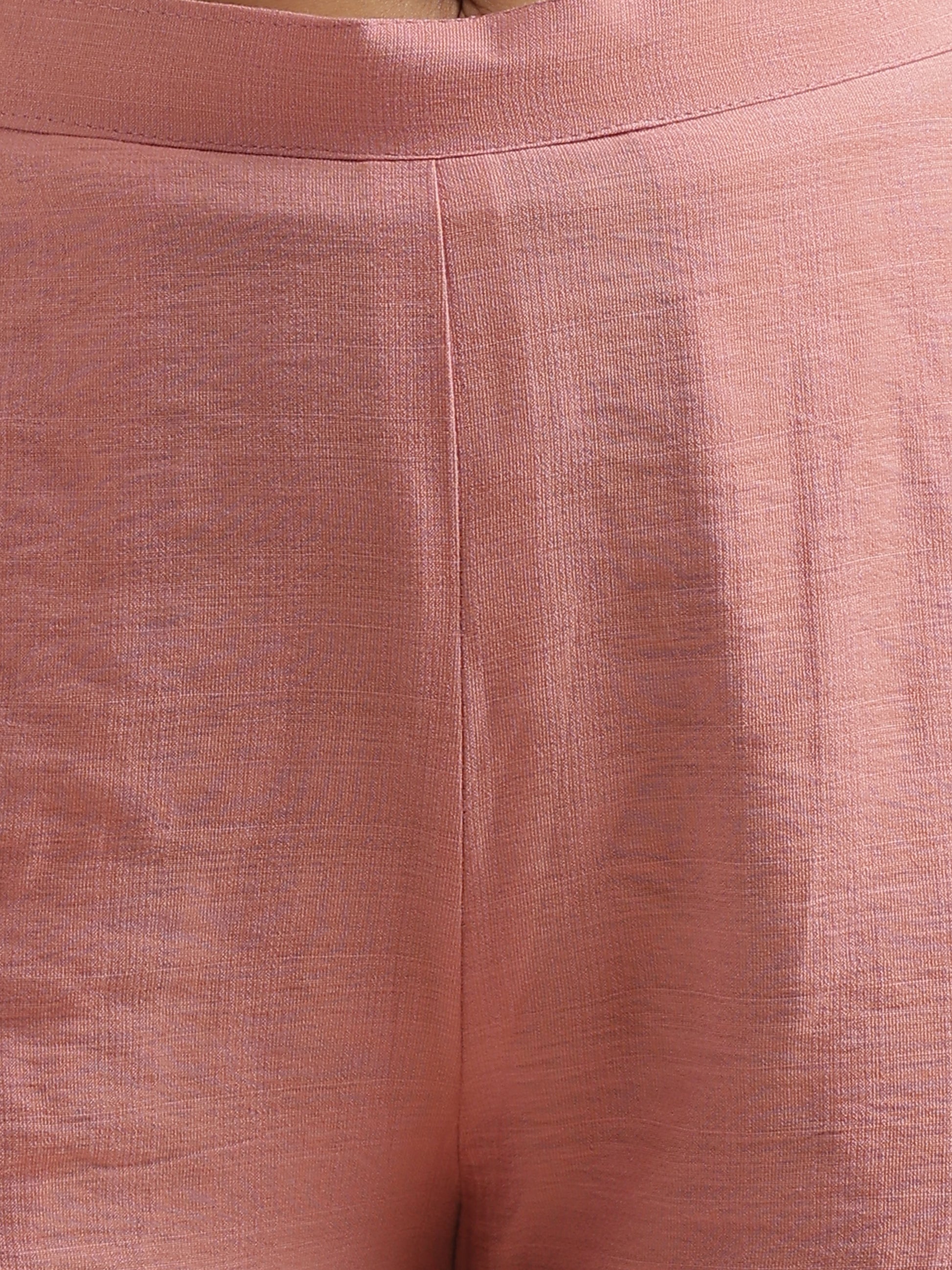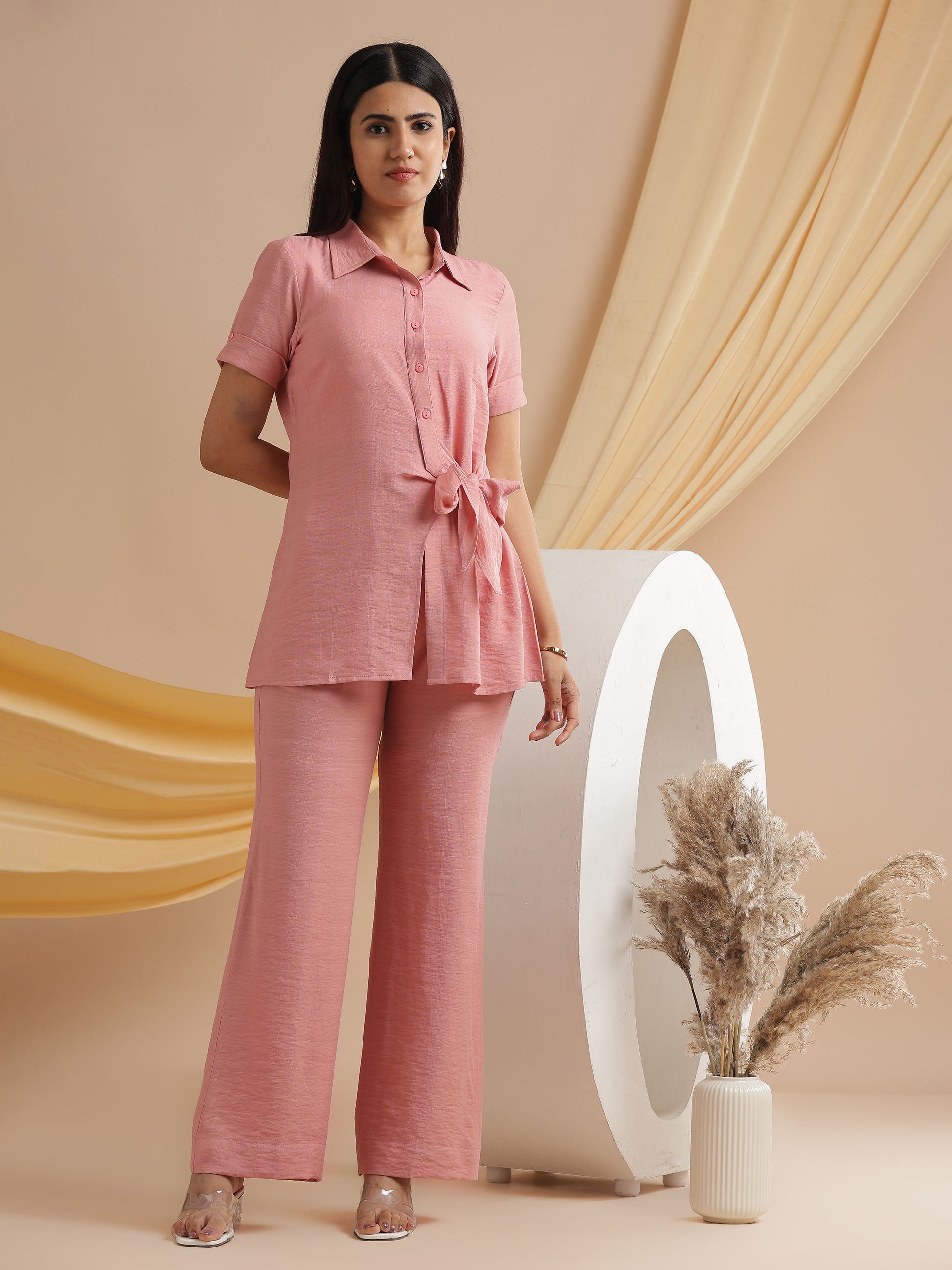 Chic breathable and endlessly versatile-this blush pink co-ord set in slub linen is your go-to choice for effortless elegance.The top features a smart shirt collar, front button closure, and a stylish side tie-up that adds definition to the waist. Paired with wide-leg pants for a flowy, relaxed silhouette, this set blends comfort and sophistication seamlessly.