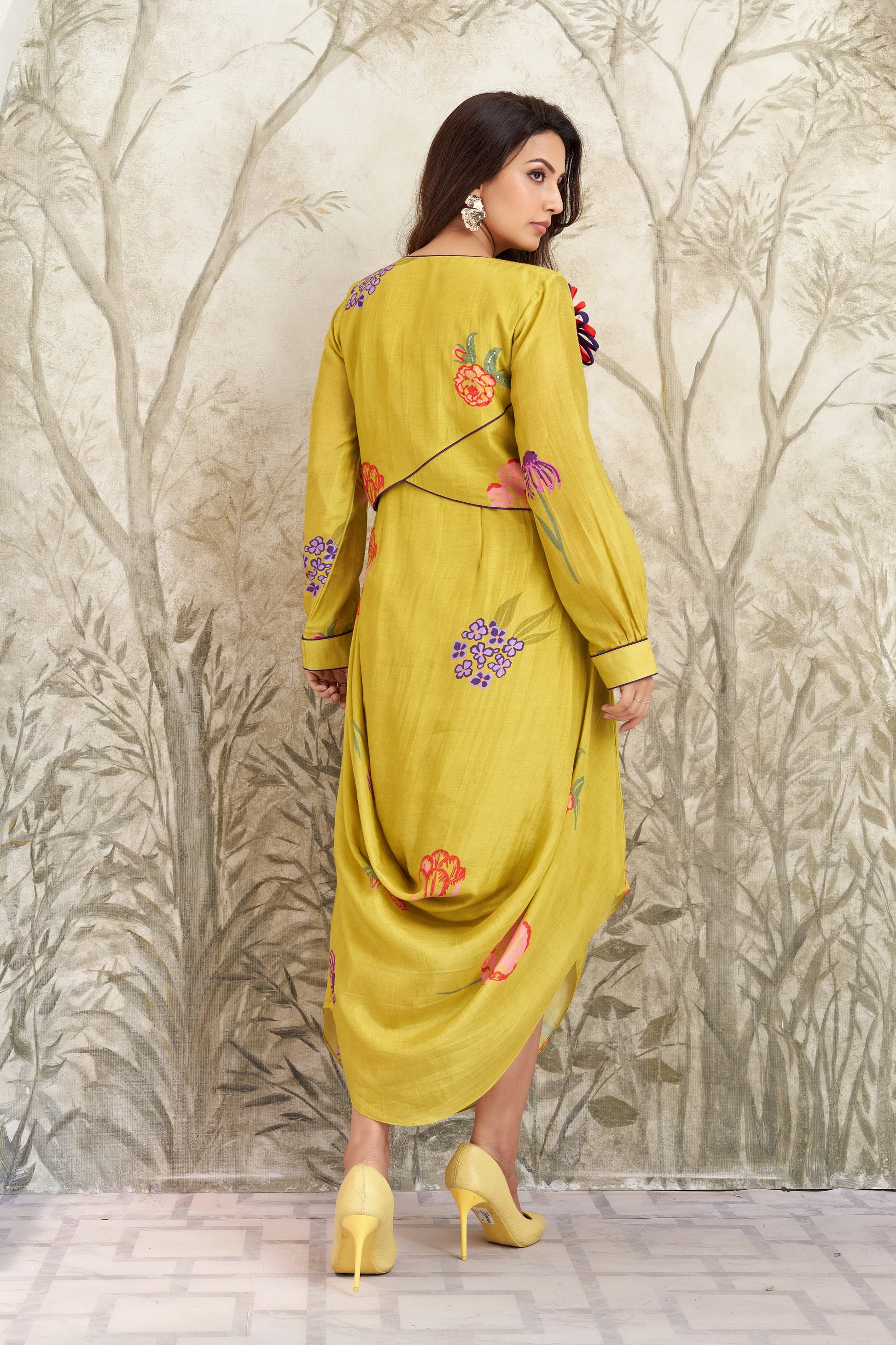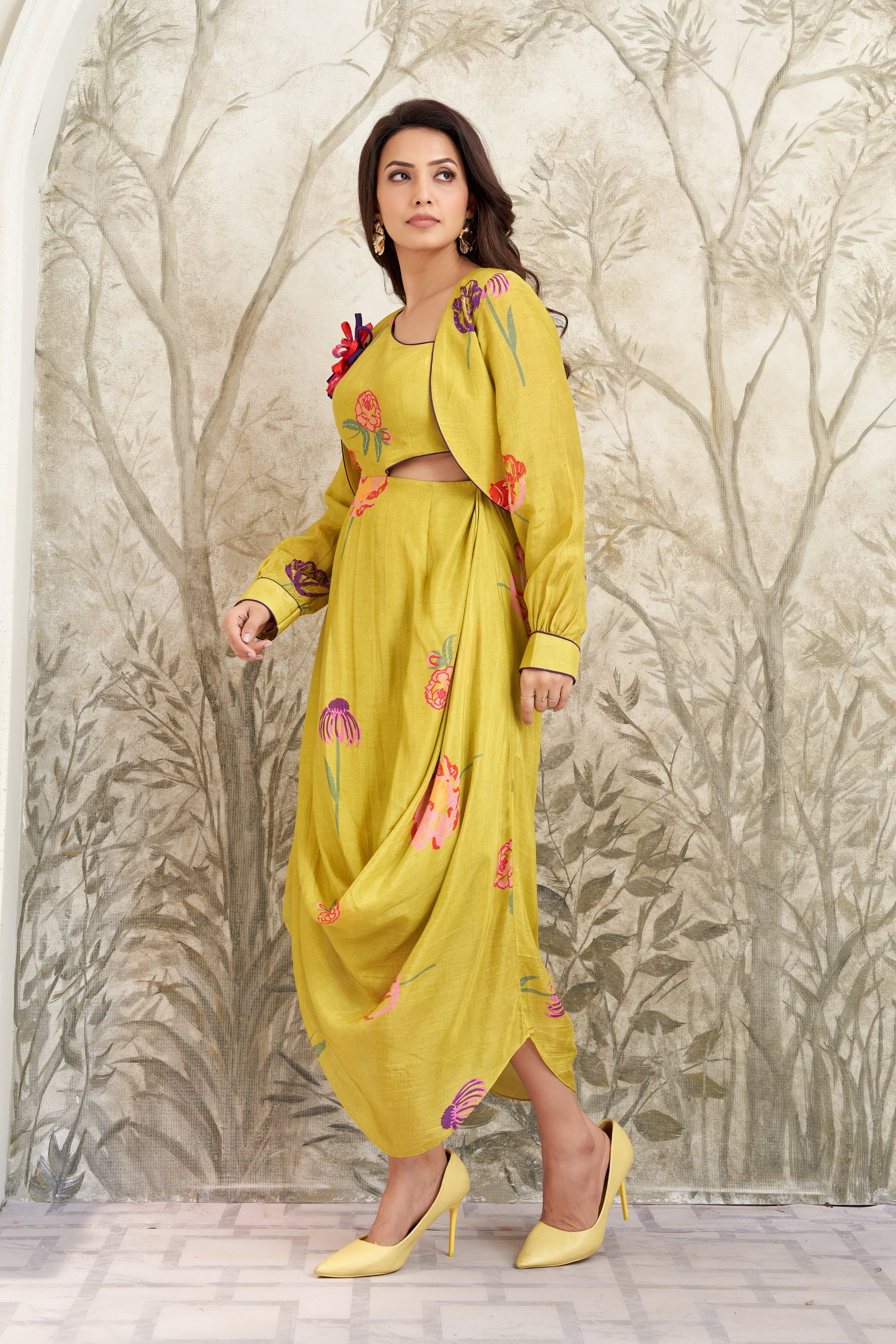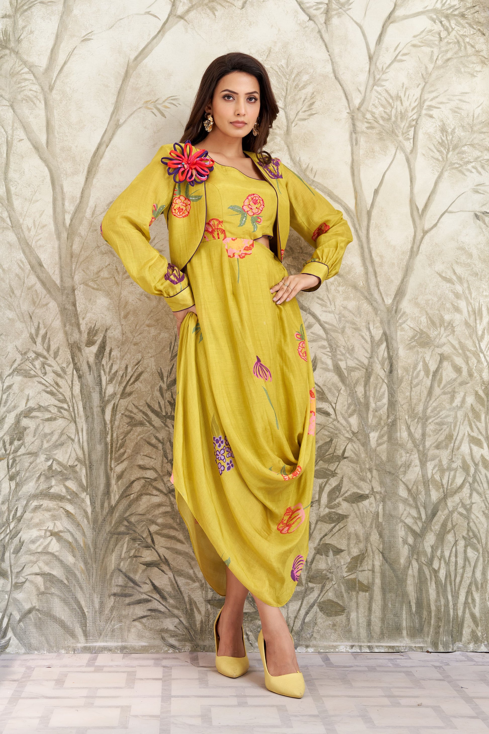 Make a bold statement with this eye-catching fluorescent green draped dress paired with a chic short jacket. Crafted in soft muslin fabric with digital floral prints, the outfit blends contemporary style with handcrafted elegance. Standout jacket features intricate hand embroidery and dramatic 3D flower appliqué on the shoulder. Perfect for festive occasions, modern gathering, and special celebrations.