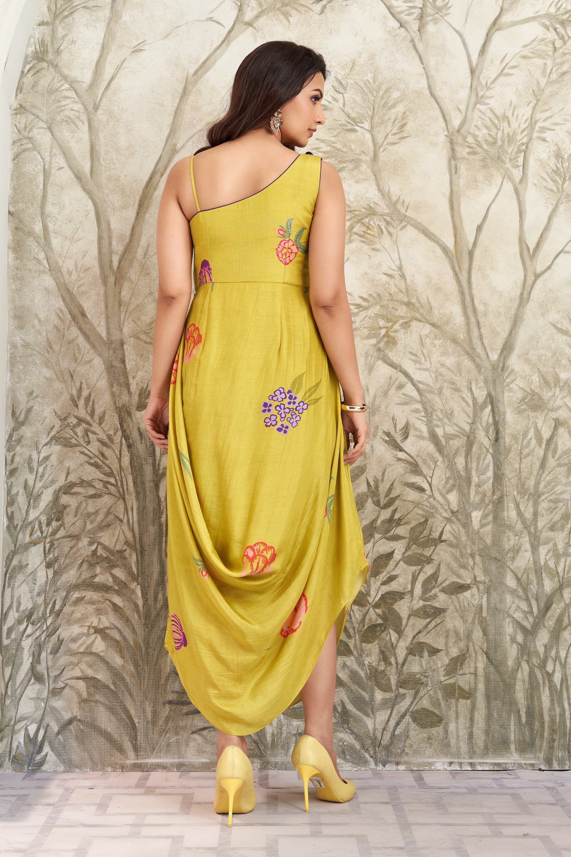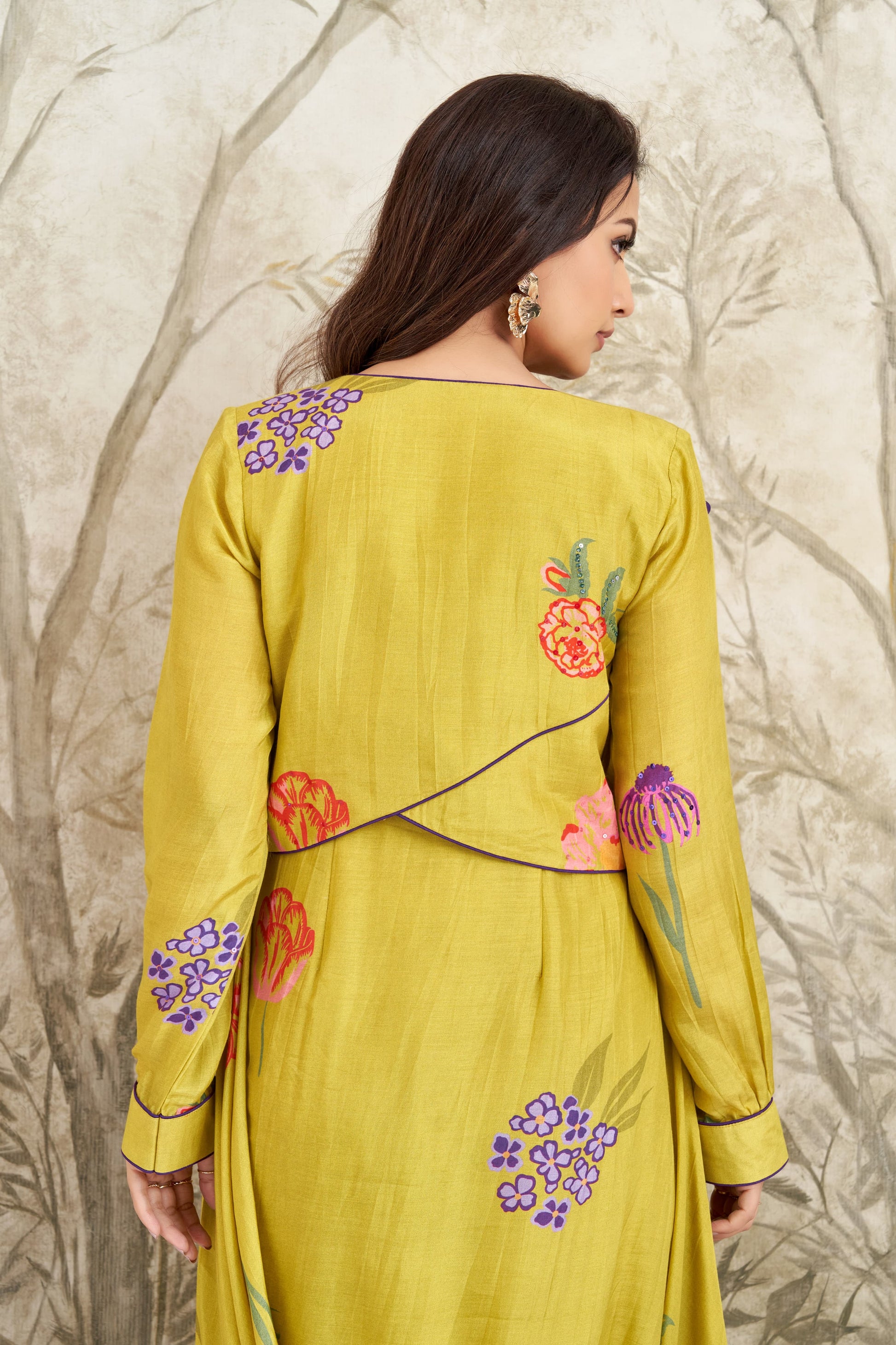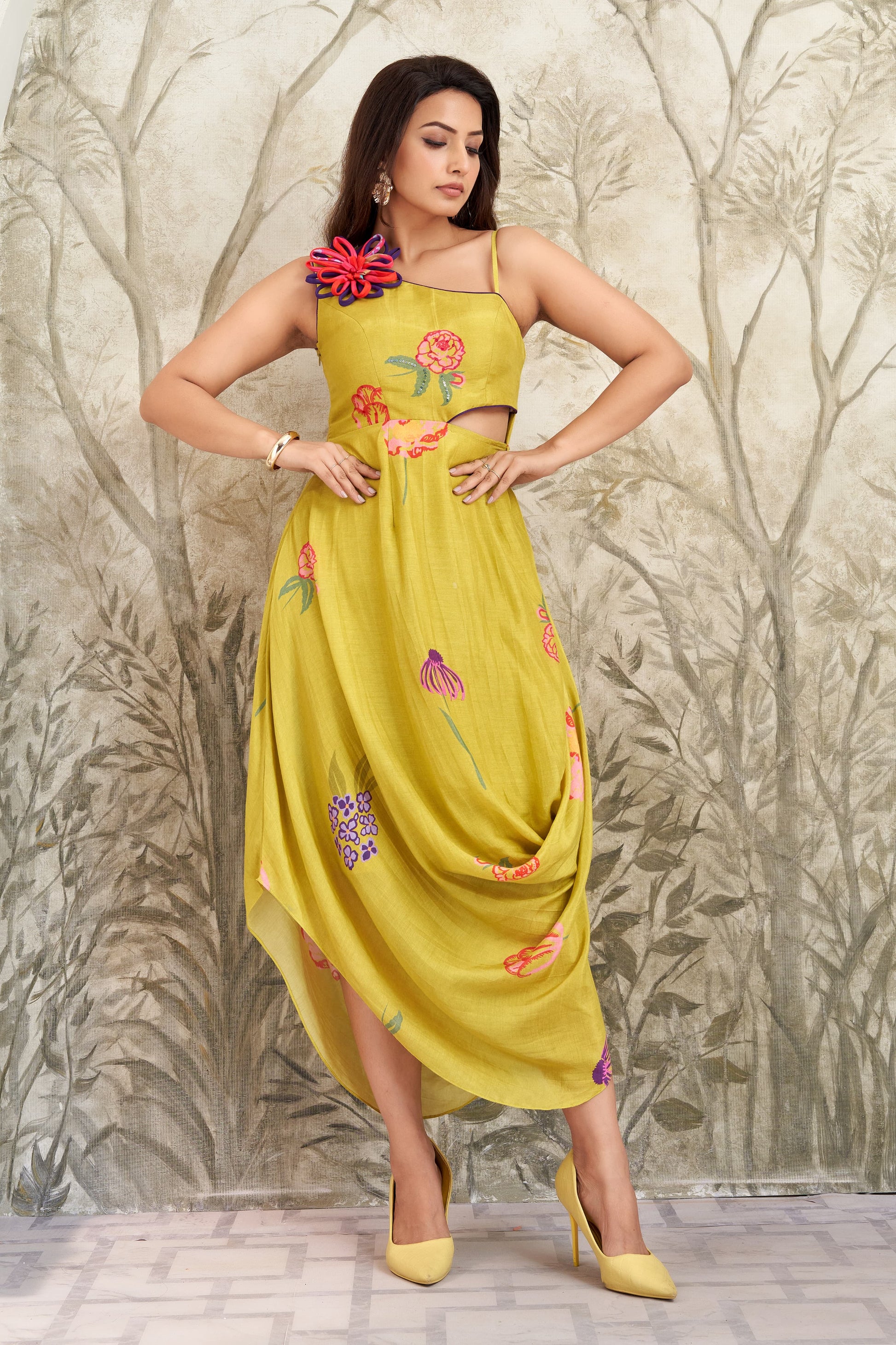 Make a bold statement with this eye-catching fluorescent green draped dress paired with a chic short jacket. Crafted in soft muslin fabric with digital floral prints, the outfit blends contemporary style with handcrafted elegance. Standout jacket features intricate hand embroidery and dramatic 3D flower appliqué on the shoulder. Perfect for festive occasions, modern gathering, and special celebrations.