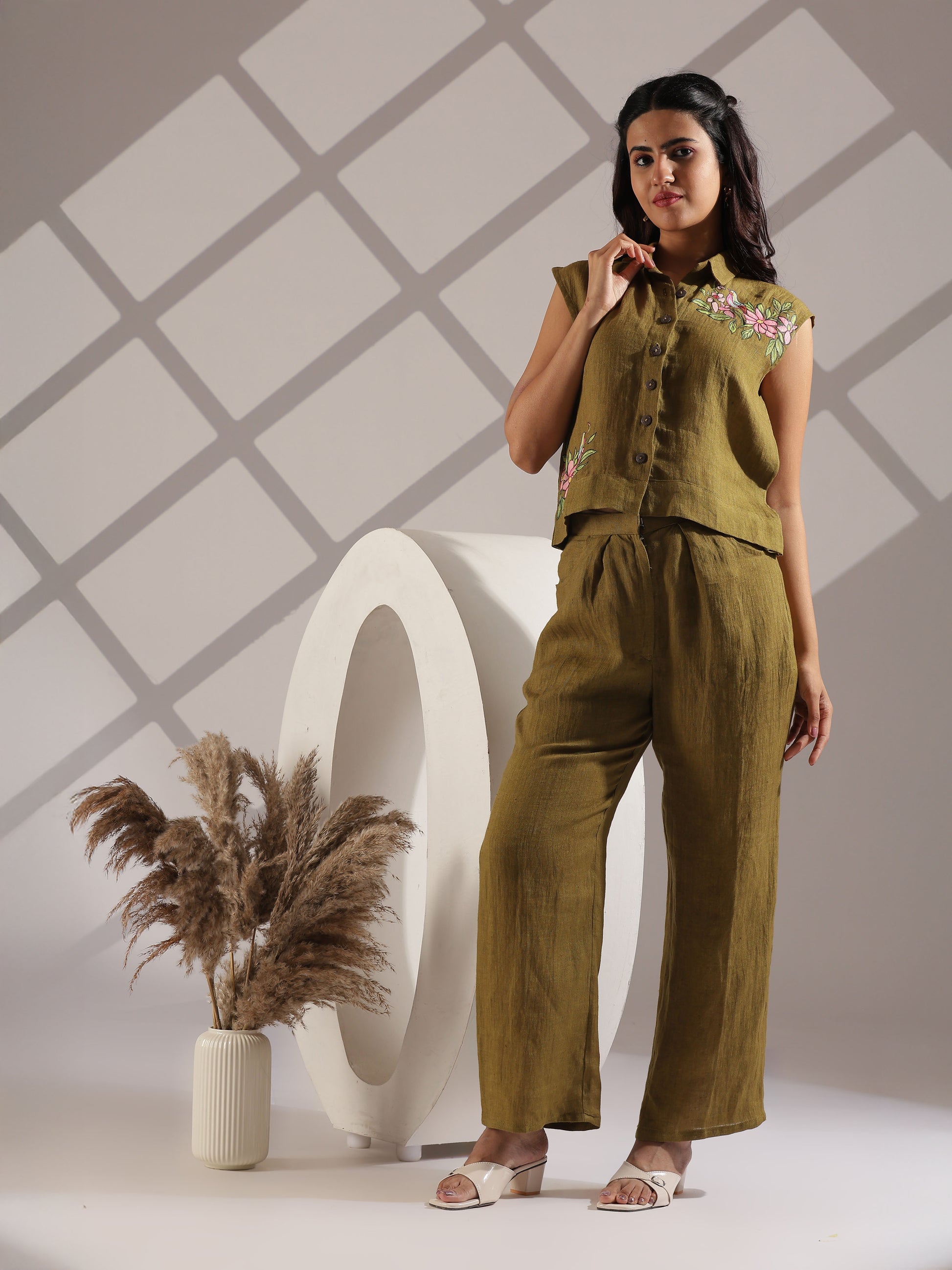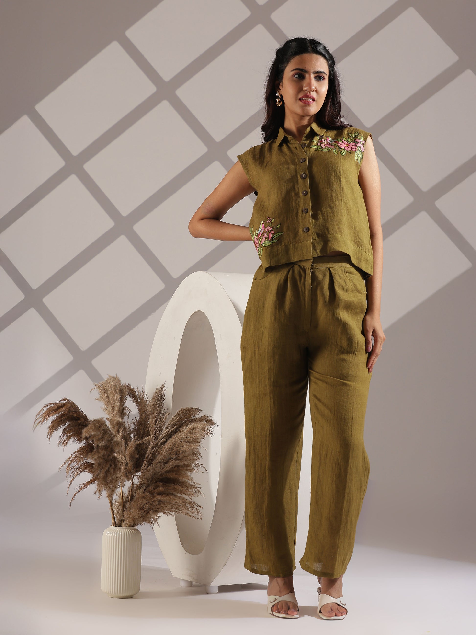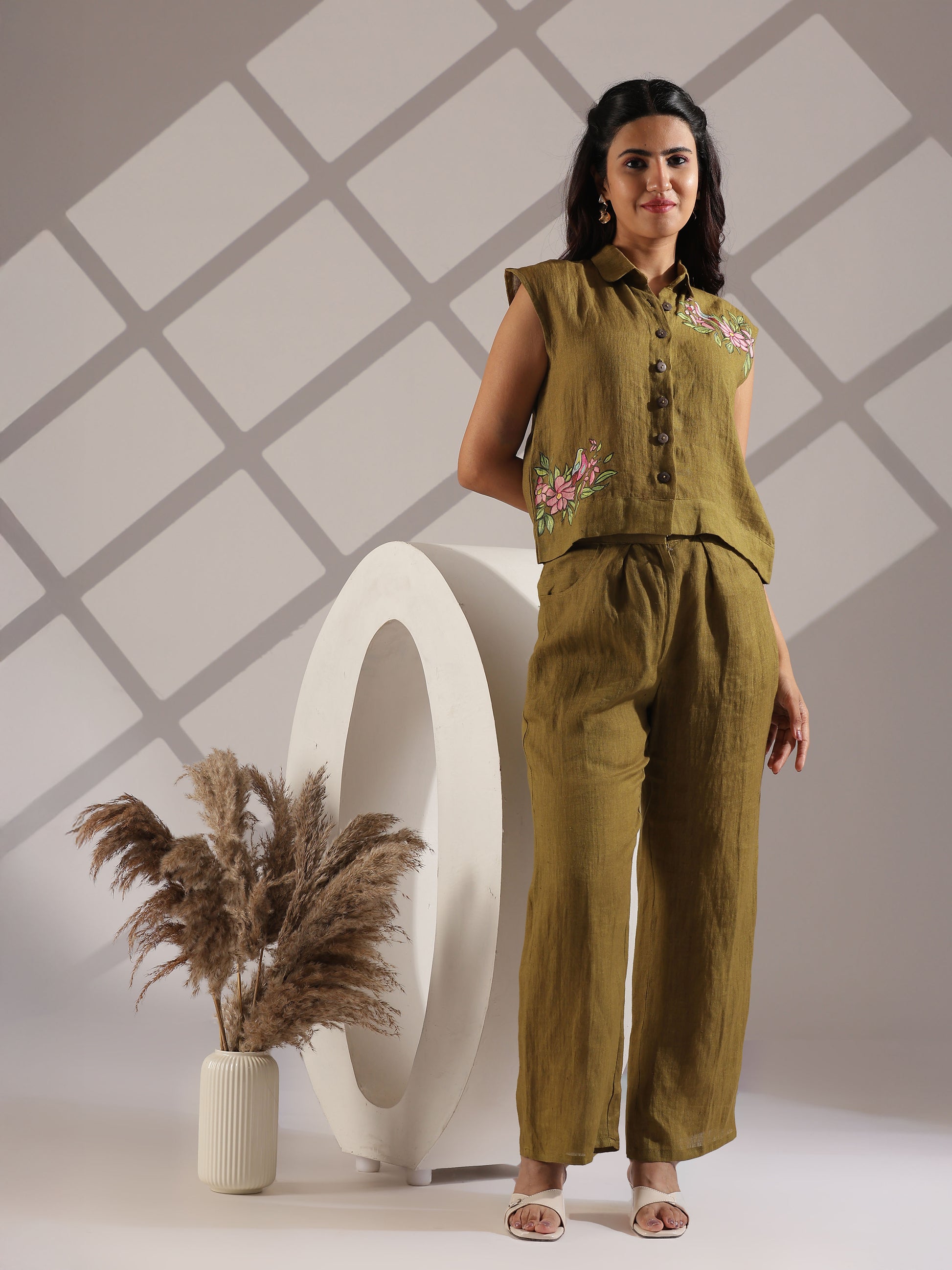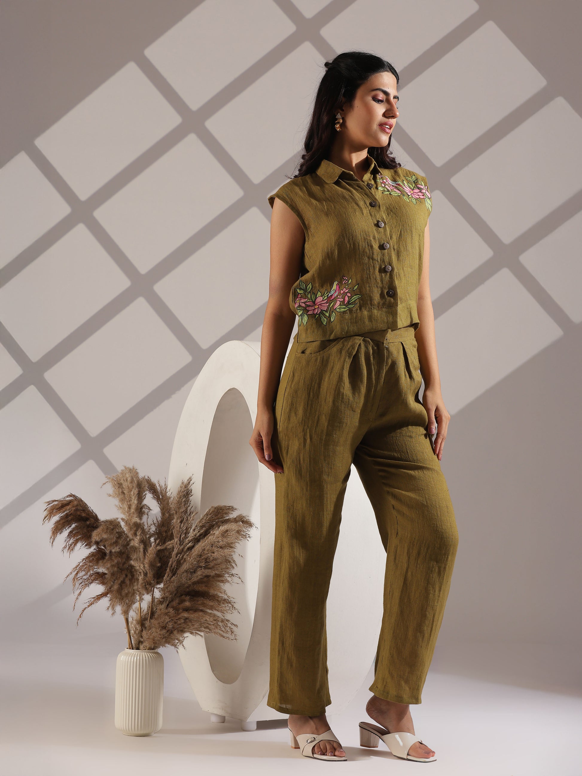 Linen hand painted co-ord set in olive green